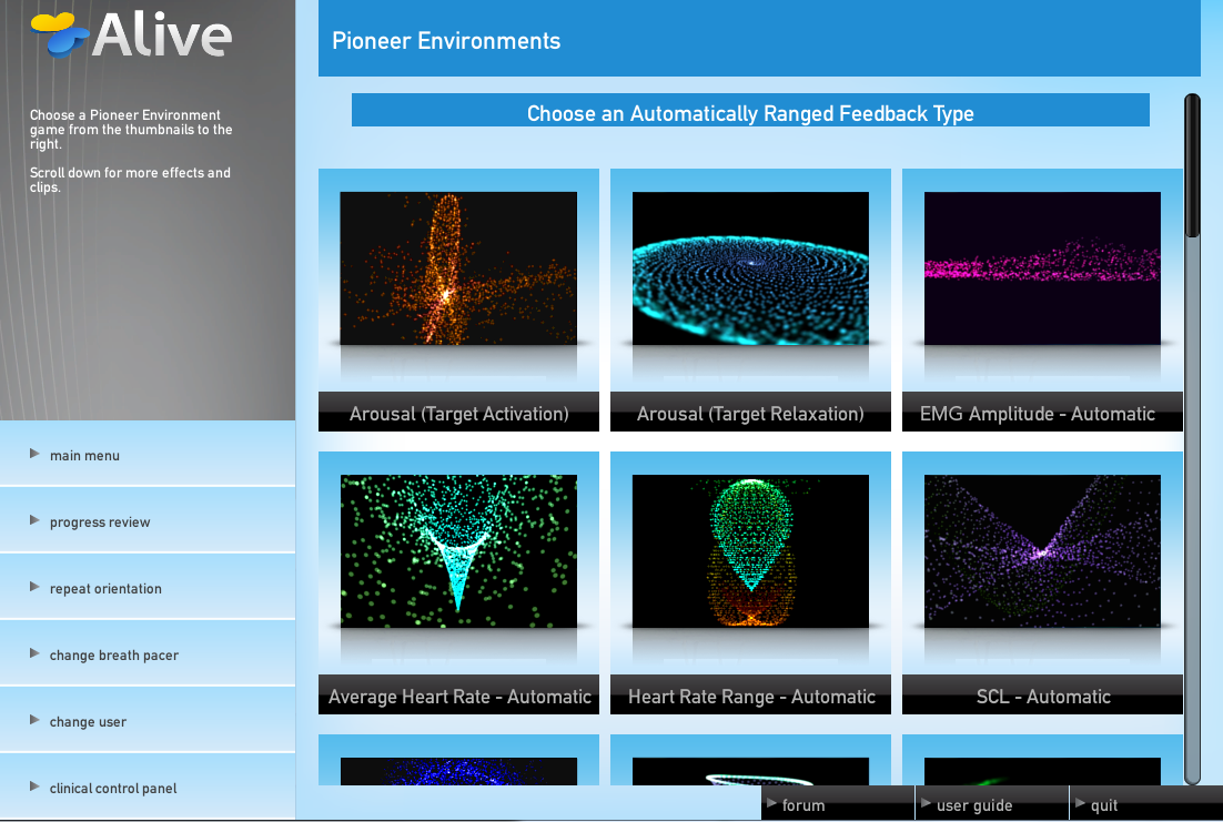 • Experienced Clinician - Finally, professional quality sensors combined with the ease and fun of Alive! Unlock new types of training with EMG and Temperature. Enhance your sessions with Pioneer's additional measurements, graphs, adaptive pacer, advanced options and the widest variety of games available for heart rate, skin sweat, EMG and temperature training available on any system.