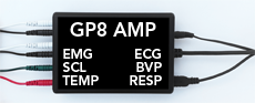 The GP8 Amp is a professional USB multi-modality sensor built by J&J Engineering. The GP8 Amp measures Temperature, 2 Channel EMG, SCL (skin conductance), ECG heart rate, BVP heart rate, and optionally, Breathing. This sensor is highly accurate, but more difficult to use. This is a good choice for trained professionals looking to make the most out of Alive. Alive can use the GP8 Amp together with the iFeel Sensor. The iFeel Sensor has a more comfortable and easy to use finger and ear heart rate sensor. If you want to train EMG, Temperature, or Respiration, or if you want a highly accurate skin conductance measurement, choose the GP8 Amp. The GP8 Amp also has inexpensive replacement sensors available, so this is a good long-term investment. Windows only.